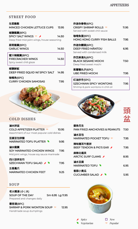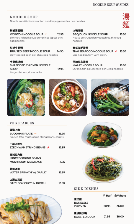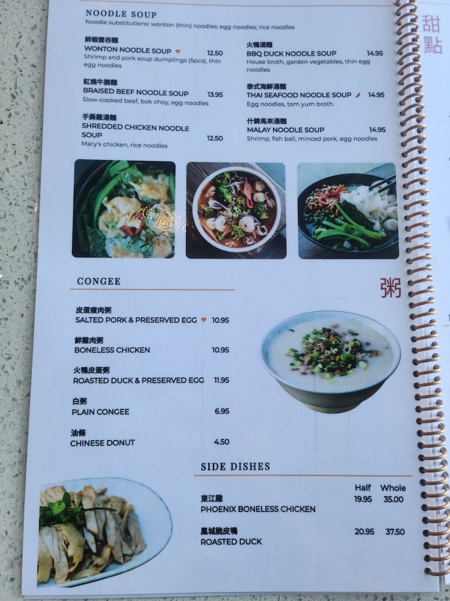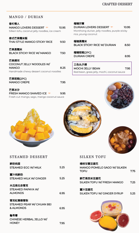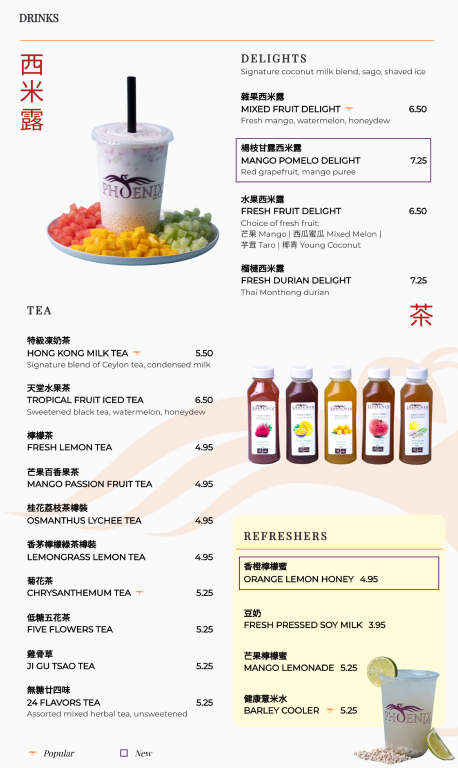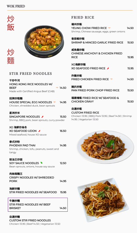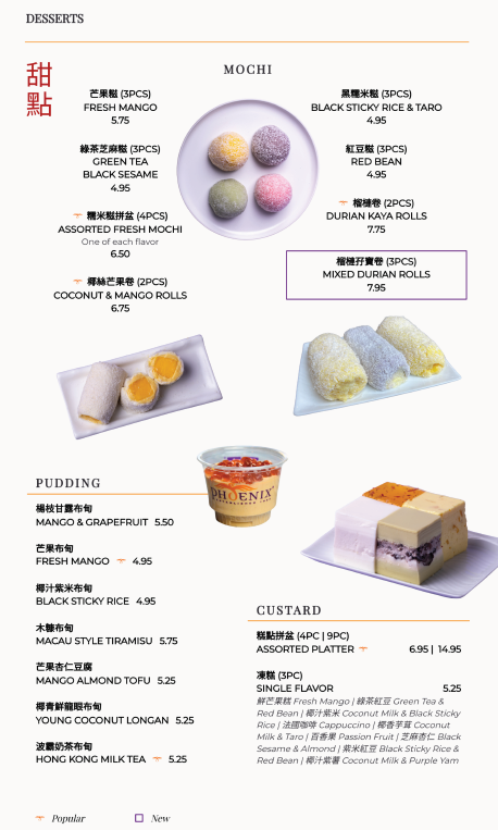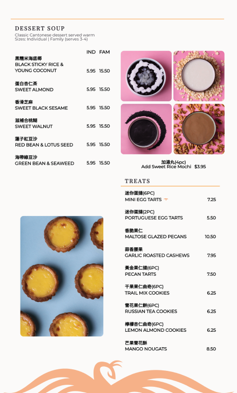 From a reviewer’s perspective, the menu at Phoenix Food Boutique in Rowland Heights feels like a carefully curated summary of Cantonese comfort food blended with popular Asian-inspired flavors, making it a satisfying conclusion to the overall dining experience. The journey often begins with cold dishes such as Cold Appetizer Platter, Marinated Tofu Platter, and Soy Marinated Chicken Wings, which set a balanced, savory tone, while street food favorites like Minced Chicken Lettuce Cups, Spicy Salt Chicken Wings (8pc), Garlic Chicken Wings (8pc), Deep Fried Squid With Spicy Salt, and Crispy Shrimp Rolls (6pc) add crunch and bold seasoning. Moving into heartier options, soups like Chef’s Soup Of The Day and Shrimp & Pork Wonton Soup offer warmth and familiarity. The main dishes span across proteins, from chicken classics such as Phoenix Boneless Chicken, Hainan Chicken, and Kung Pao Chicken, to pork specialties like Hakka Braised Pork Belly, Sweet & Sour Pork Chop, and Mapo Tofu W/ Pork, as well as beef standouts including Mongolian Beef, Angus Beef W/ Korean BBQ Sauce, and Kung Pao Beef. Seafood lovers are equally rewarded with choices like Garlic Chili Shrimp, Shrimp & Glazed Walnuts, Kung Pao Shrimp, and Fish Fillet W/ Spicy Salt. The menu rounds out with satisfying staples such as Yeung Chow Fried Rice, XO Seafood Fried Rice, Hong Kong Rice Noodles W/ Beef, Singapore Noodles, and comforting bowls like Braised Beef Stew Noodle Soup or Shrimp & Pork Wonton Noodle Soup. To finish, an impressive dessert and drink selection-ranging from Mango Pomelo Delight, Fresh Mango Mochi (3pc), Black Sesame Pudding, to beverages like Hong Kong Milk Tea and Fresh Lemon Tea-leaves a sweet, memorable final impression. Altogether, the menu reflects variety, balance, and approachability, reinforcing Phoenix Food Boutique as a place where both classic flavors and modern tastes come together seamlessly.